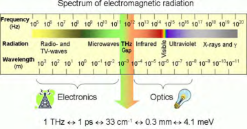 太赫茲介于遠紅外和微波之間,通常把 0.1-10THz, 頻段被稱為太赫茲波段1THz 對應(yīng)波數(shù)為 33.3cm-1,光子能量4.1meV,波長 300um