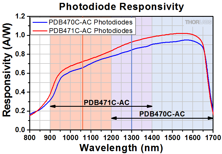 備注:兩條垂直線標(biāo)有1060納米(紅色)和1300納米(藍(lán)色)。陰影區(qū)域表示的每個(gè)指定探測(cè)器的波長(zhǎng)范圍。